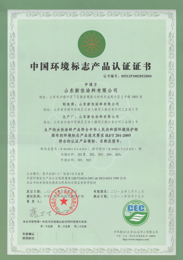 中國環(huán)境標(biāo)志產(chǎn)品認證證書